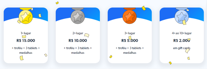 5. Premiação: Além de ter a oportunidade de participar da maior competição de matemática online do mundo, a Olimpíada proporciona a oportunidade de conquistar prêmios incríveis para os melhores desempenhos. Serão premiadas as 10 escolas com melhor colocação no ranking, além de certificados de participação e moedas Matific para todos os envolvidos de acordo com a performance de cada aluno, proporcionando um saudável senso de realização.
