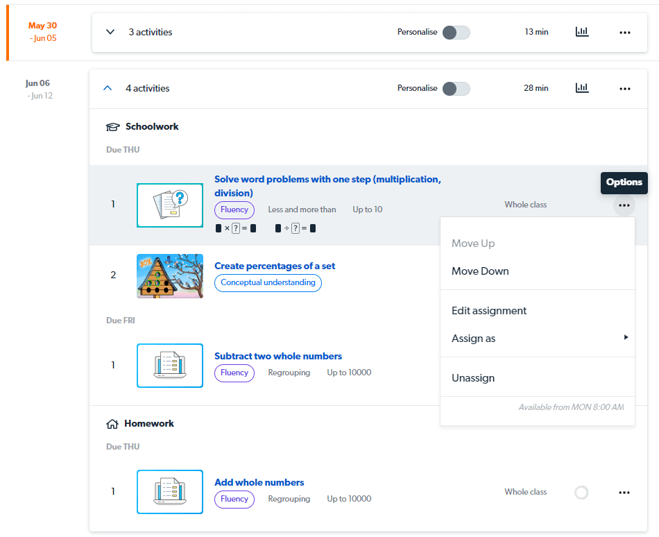 Opening a week allows you to view all the activities assigned for that week, with further options to customize the order your students will see activities, and edit the dates of an individual activity: