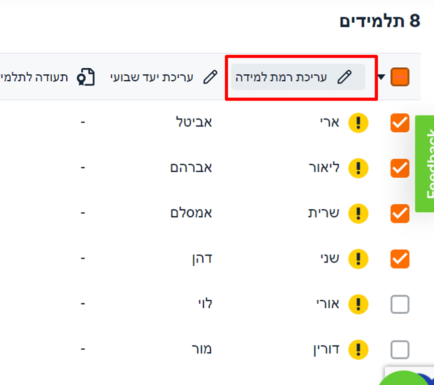 ת: כמובן! תוכלו לסמן וי ליד שמות של כמה תלמידים ביחד וללחוץ על 'עריכת רמת למידה' בסרגל העליון. תוכלו לשנות גם את האתגר השבועי באותה דרך.