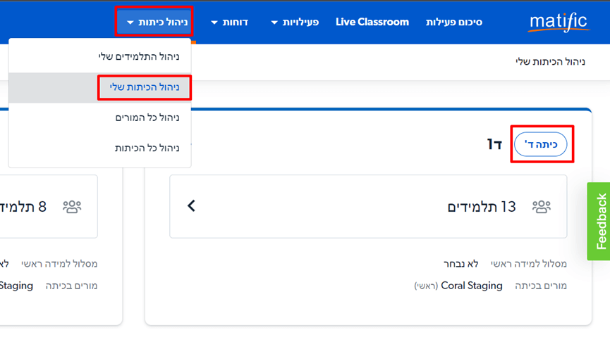 ת: לוחצים על 'ניהול כיתות' > 'ניהול הכיתות שלי'. שם תוכלו לראות את שם הכיתה ומימין את רמת הכיתה